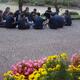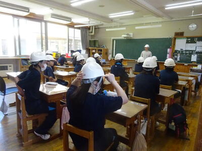 地震想定避難訓練です。余震を想定して「逃げない」スタイルの訓練です。