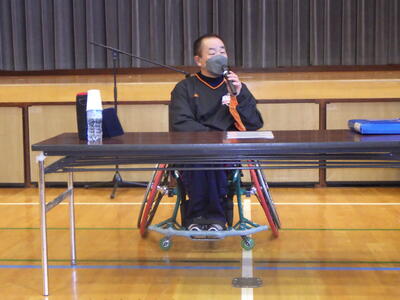 長野県障がい者スポーツ協会より奥原明男さんをお招きし、「スポーツってすばらしい~バリアフリーな社会をめざして~」をテーマにした講演と、車椅子バスケットを実演していただきました。